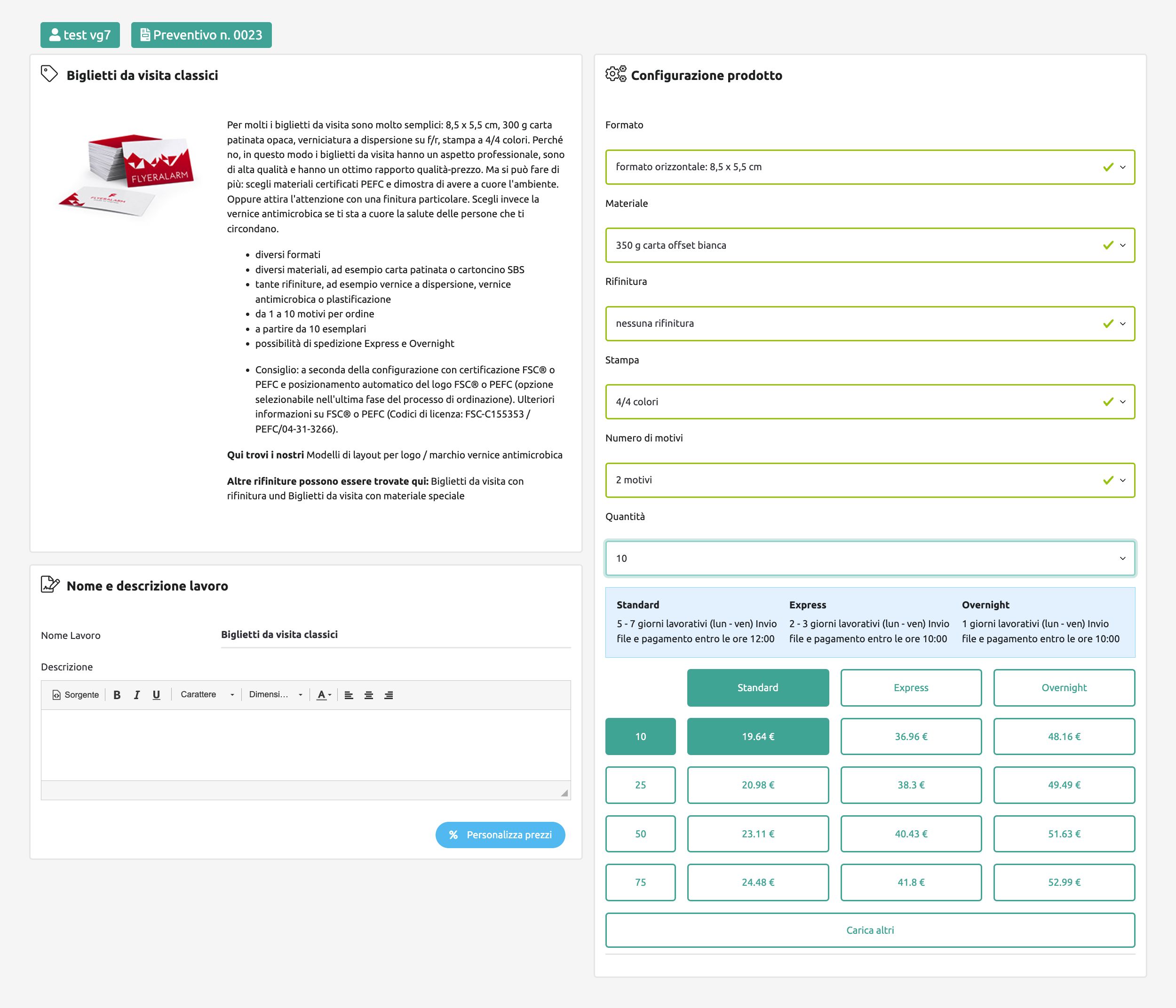 Permette il calcolo simultaneo dello stesso preventivo per più quantità, mostrando il risultato in un’unica pagina. Utile, per esempio nei casi in cui sia necessario inviare al cliente un’offerta con più tirature.