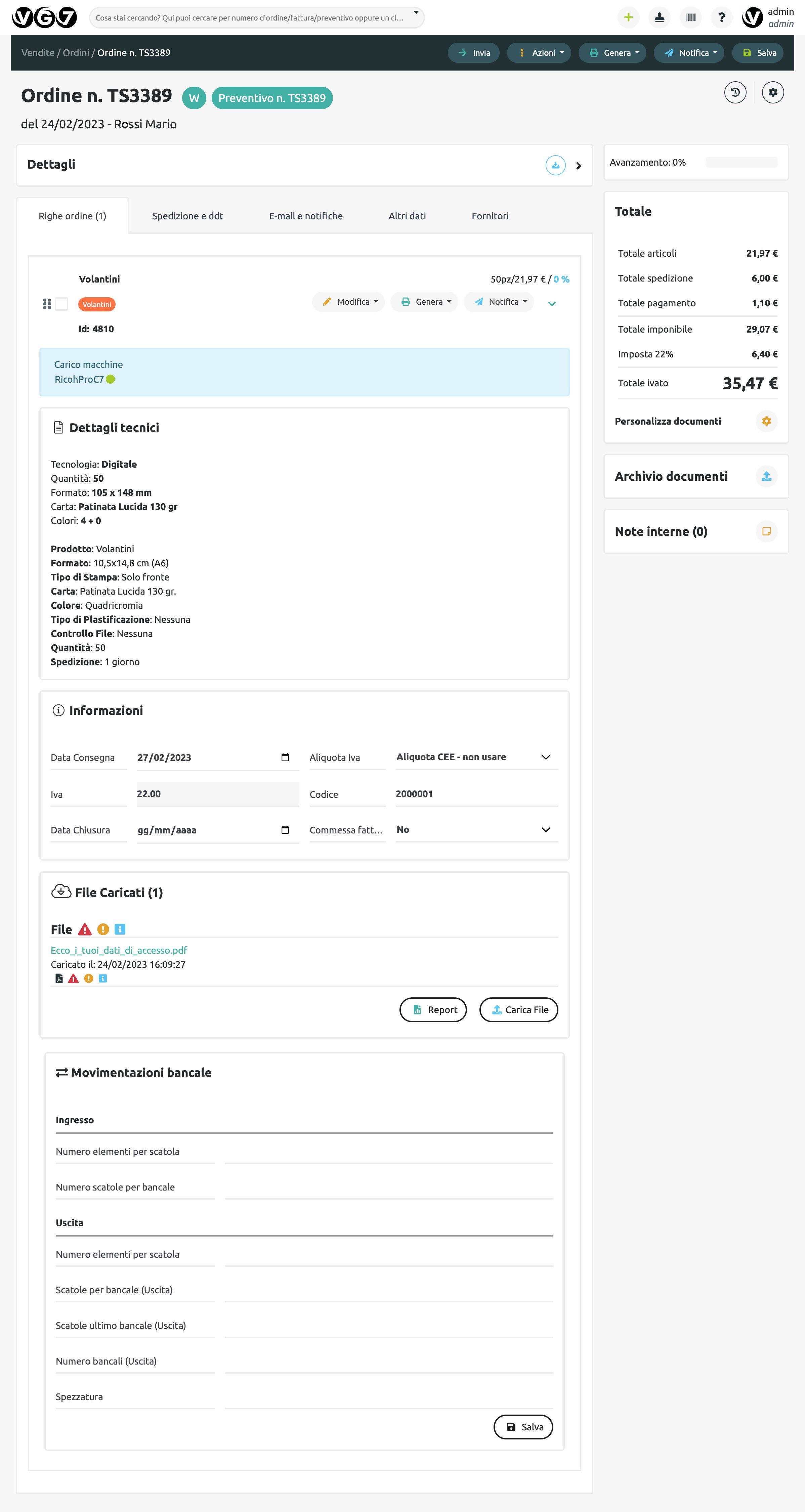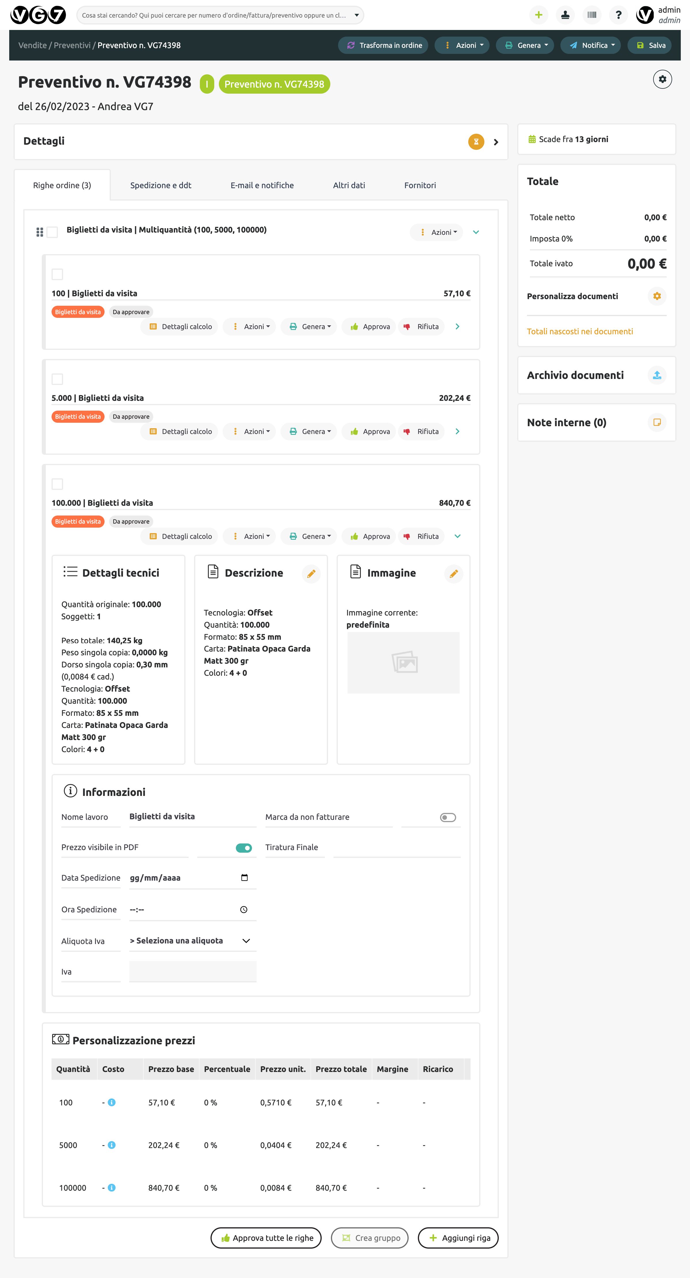 Il VG7 ERP semplifica e velocizza la preparazione di preventivi e ordini. Una volta configurati i parametri tecnico-economici della piattaforma, è sufficiente scegliere le impostazioni utili per effettuare il calcolo automaticamente. Il sistema permette quindi a chiunque in azienda di fare un preventivo di stampa, semplice o complesso.