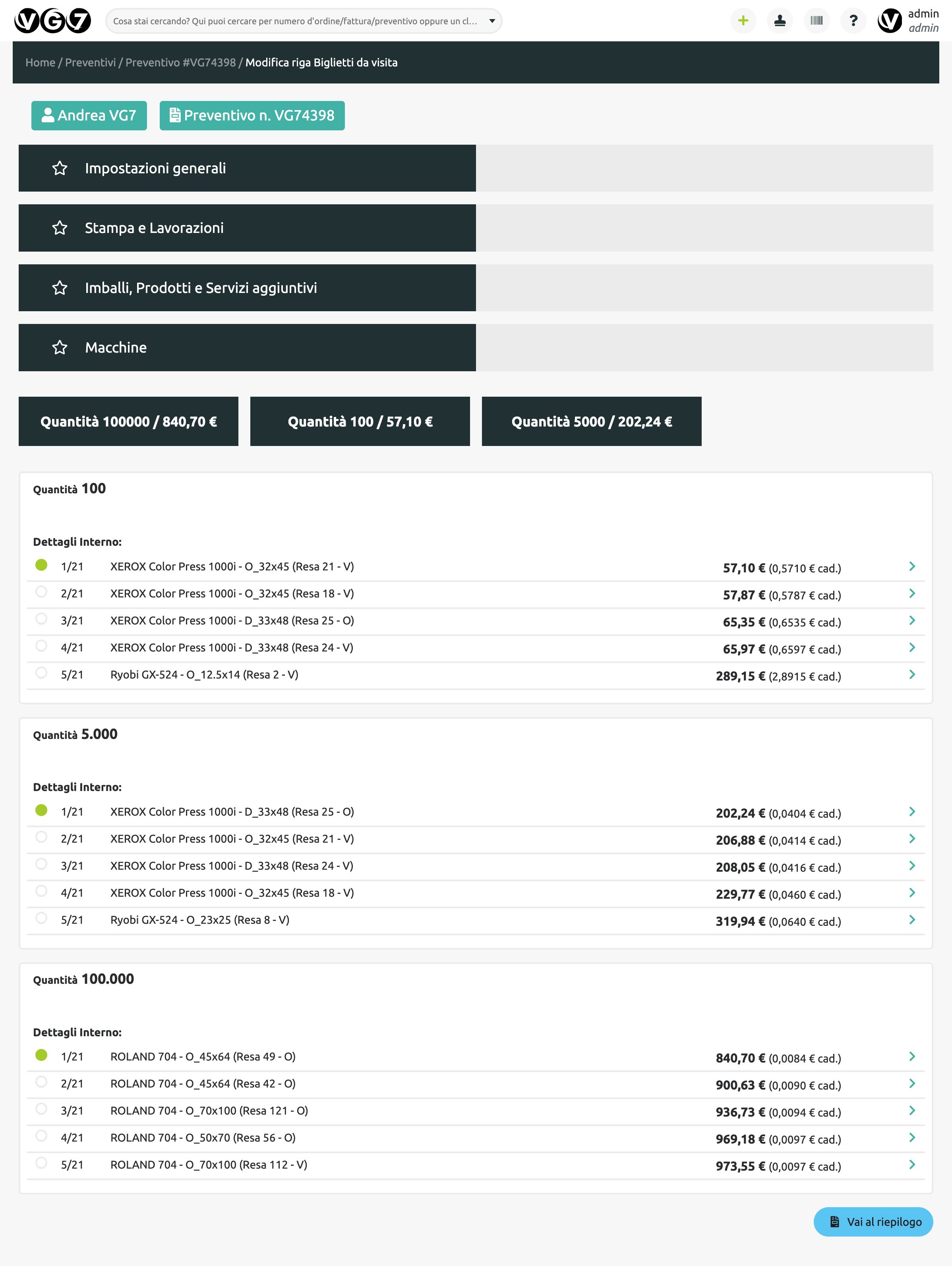Il VG7 ERP ottimizza ogni aspetto della realizzazione del prodotto. In base ai parametri tecnici ed economici di ogni macchina o lavorazione, il preventivatore è in grado di fornire preventivi realizzati con tecnologie di stampa differenti (per esempio digitale od offset), in modo da determinare la soluzione più vantaggiosa ed efficiente.