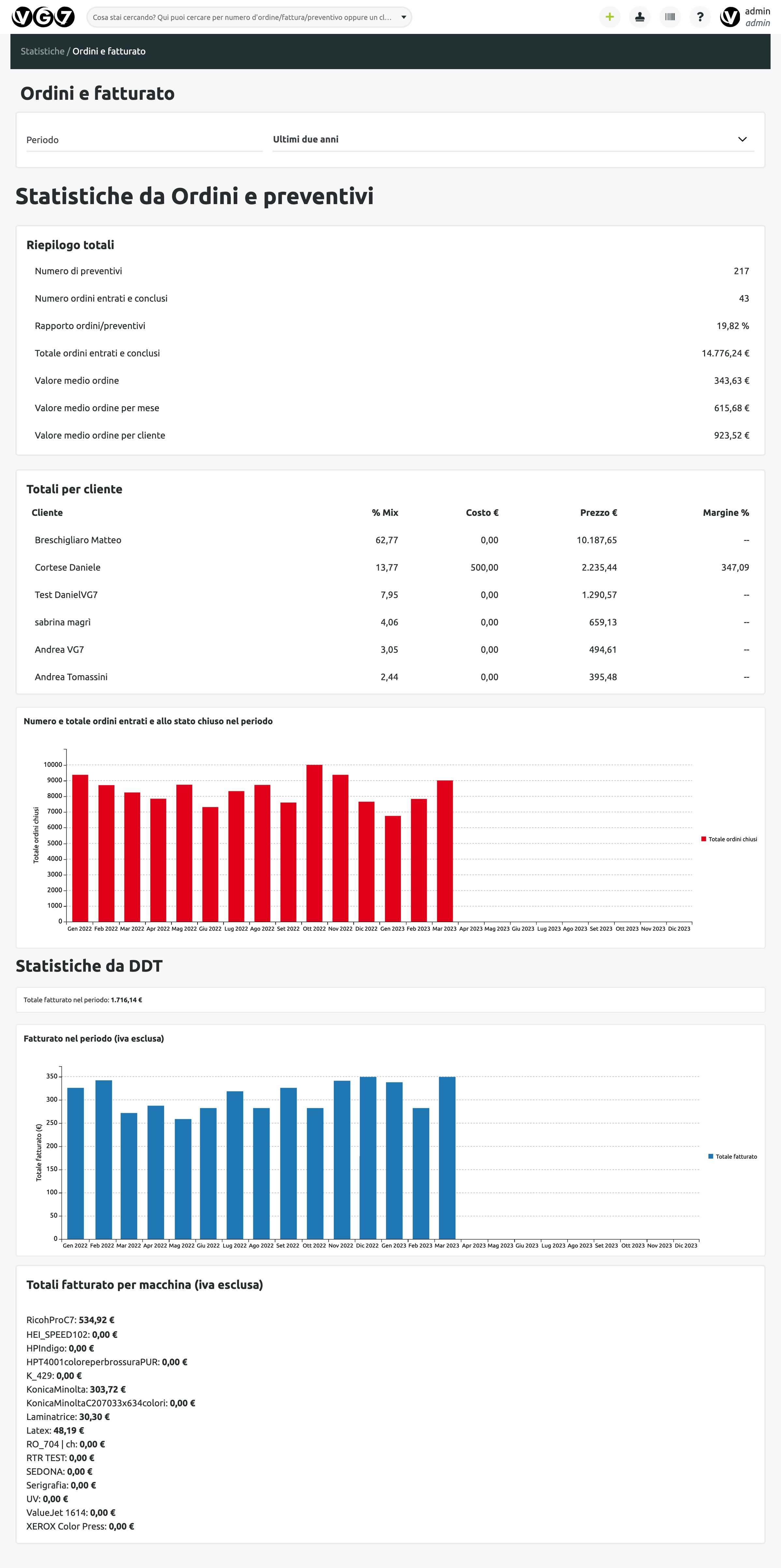 Il sistema fornisce una reportistica dettagliata sullo stato delle attività all’interno del VG7 ERP con grafici e dati statistici su: preventivi, ordini e fatturato, clienti e categorie di clienti, centri di costo, singoli prodotti o tipologie di prodotti più venduti, utilizzo, fatturato e consumo di materiale per singola macchina.